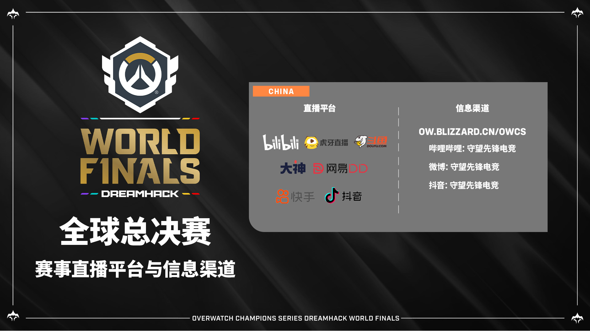 在五天赛事期间,观众可通过观看《守望先锋》客户端内“全球总决赛”/哔哩哔哩/斗鱼/虎牙/抖音/快手/网易大神/网易DD 任意平台官方直播获取丰厚的观赛奖励。